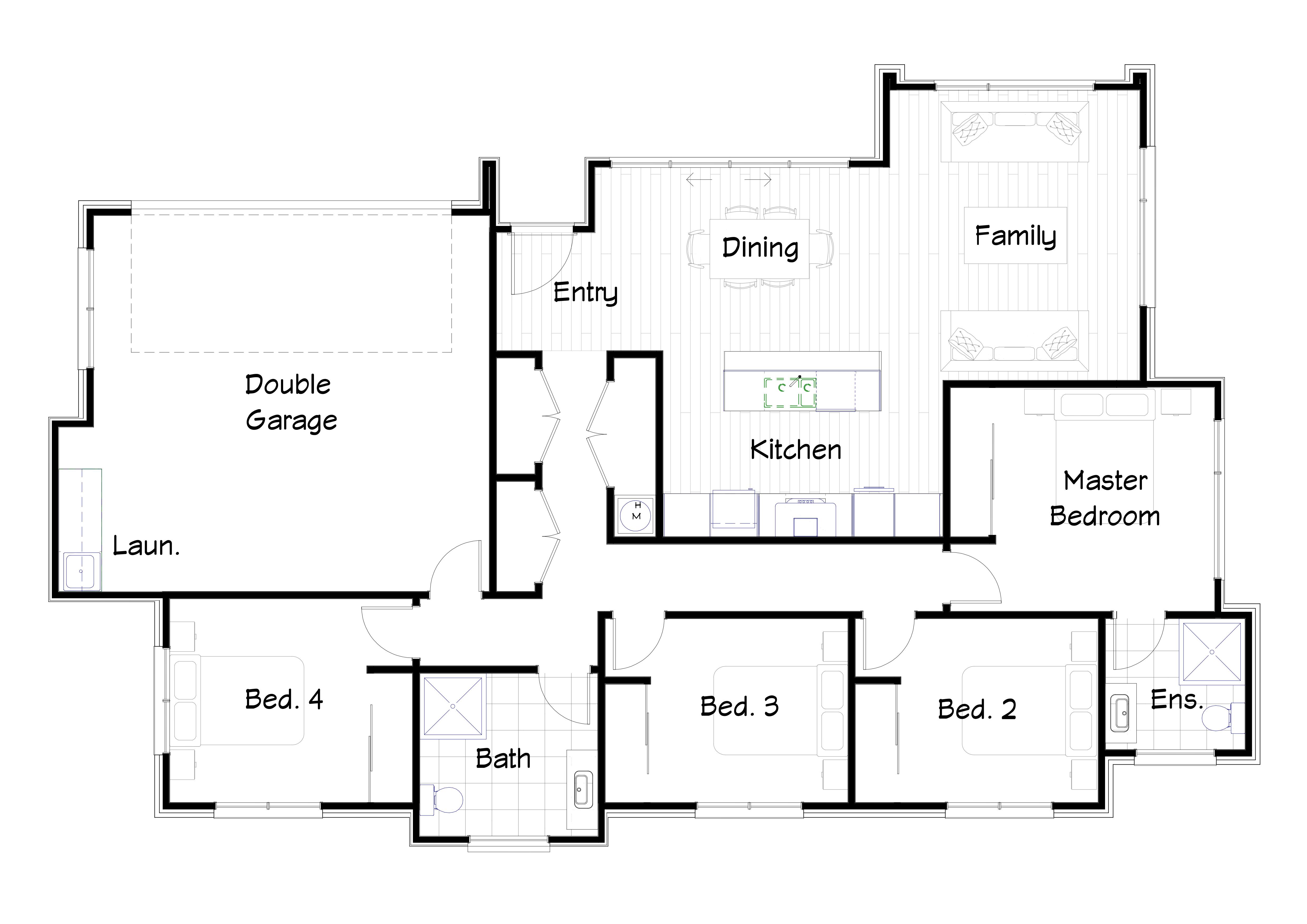 - Open plan kitchen, family, dining